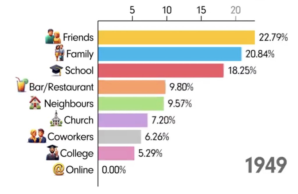 Este vídeo recoge casi un siglo de hábitos de ligar: desde 1930 hasta 2024 y en él aparecen opciones clásicas como amigos, familia, en un bar, en el trabajo, vecinos, en la universidad o en el colegio, en la iglesia y por supuesto, en internet. Obviamente, en los años 30 y las décadas posteriores, la opción de Online era un tremendo cero. Pero ojo porque en 1981 comienza tímidamente con un 0,01%.